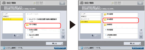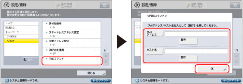 IPv6アドレスを検証する:[IPv6アドレス]を押して、ネットワーク上に存在する任意のIPv6アドレスを入力したあと[実行]を押します。タッチパネルディスプレーにPINGコマンドの実行結果が表示されたら、[OK]を押してください。