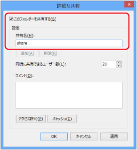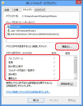 Active Directory環境では、共有フォルダーのセキュリティーの設定手順は上記と異なります。詳細は、Windowsの説明書を参照してください。