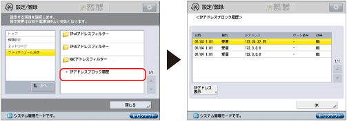 本製品とのデータ送受信を拒否するIPアドレスを設定した場合、そのIPアドレスを持つ機器と本製品間でデータを送受信しようとしたとき、ブロック履歴が残ります。また、データ受信のときは、IPアドレスとともにポート番号のブロック履歴も残ります。
