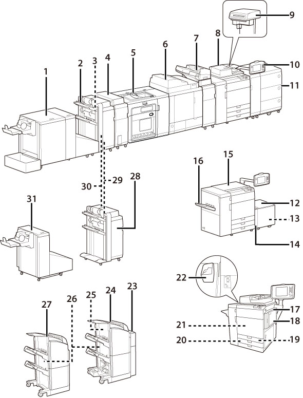 本製品を操作するのに必要な、キーやタッチパネルディスプレー、ランプなどがあります。(→操作パネル各部の名称とはたらき)