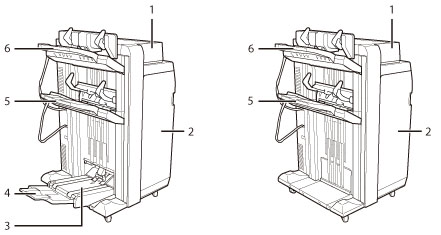 ![]() フィニッシャーのトレイから用紙をとるときは、フィニッシャーの排紙口側に手をかけないでください。トレイが上昇して、手をはさむ恐れがあります。
