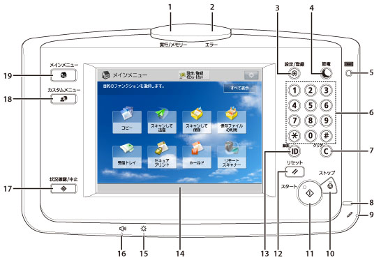 本製品が動作中は緑色に点滅します。待機中のジョブやメモリー受信文書があるときは緑色に点灯します。