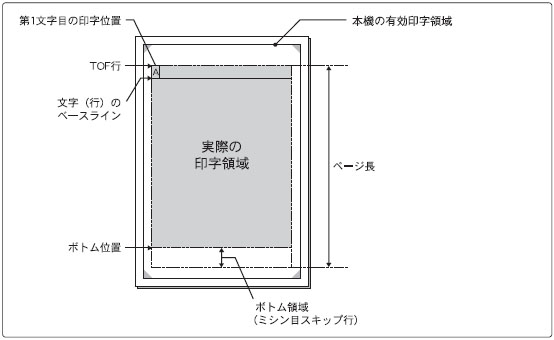 本エミュレーションモードでは、実際の用紙上での印字位置と印字領域について次の用語で説明しています。