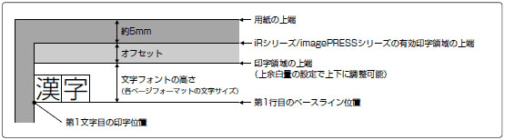 Fmode 3, 4, 7, 8でA3、B4、A4サイズの用紙を使用するときや、Fmode 6でA3、B4サイズの用紙を使用するときは、印字が用紙の中央にレイアウトされるように、先頭行の文字の上端をiRシリーズ/imagePRESSシリーズ/imageRUNNER ADVANCEシリーズの有効印字領域の上端からのオフセット量で調整しています。