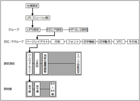 ESC/Pエミュレーションモードの印字環境の設定項目や設定値は、この中のESC/Pグループに含まれています。「ESC/P設定」というグループ階層を選択すると、ESC/Pエミュレーションモード専用の7種類のメニューグループが表示されます。