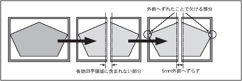 iRシリーズ/imagePRESSシリーズ/imageRUNNER ADVANCEシリーズは用紙端から5 mm内側が有効印字領域であるため、中央の分割部分が有効印字領域内に入るように、中央から外側へ5 mmずつ作図データをシフトします。したがって、1ページ目の左側と2ページ目の右側の端にデータがある場合は印刷されない場合が出てきます。