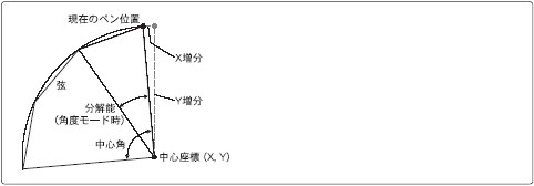 円弧の中心点を現在のペン位置から相対座標で指定します。