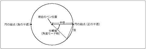円の半径を指定します。円プロットの開始点は、半径が正の値のときは現在のペン位置から見て0度、負の値のときは180度の位置になります。