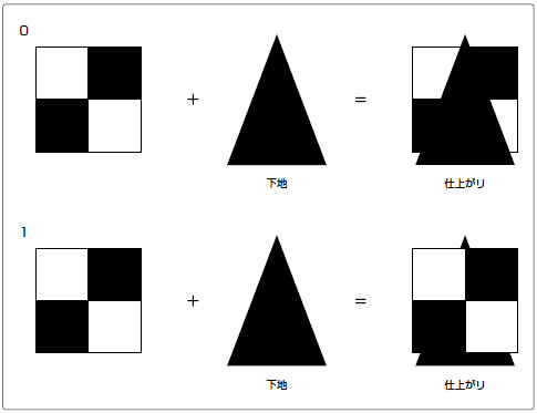透過モードを設定します。下地の黒ピクセルの上に白ピクセルをかぶせた場合、重なった部分の色は下地の黒になります。