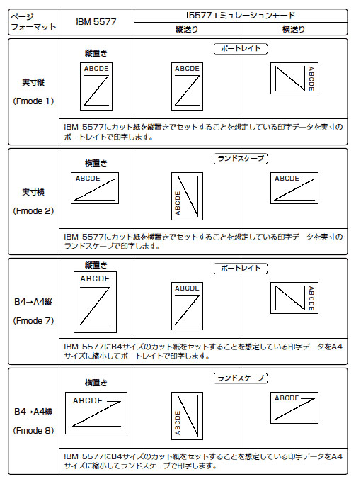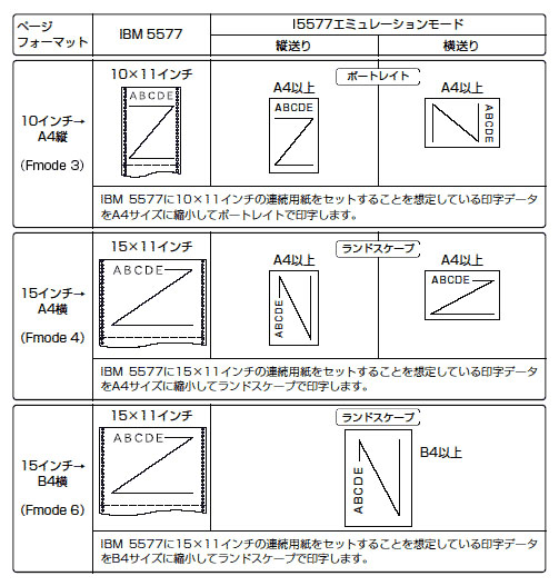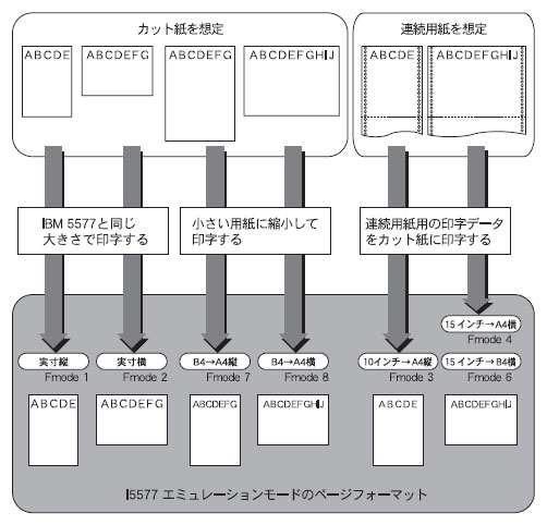 ページフォーマットFmode 1, 2では、IBM5577の印字結果と同じ大きさ(実寸)で印字します。これに対して、Fmode 7, 8は、印字データを縮小します。