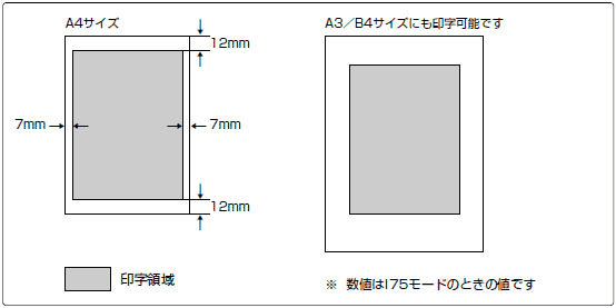 ただし、A3、B4サイズの用紙を使用しても、A4サイズのときと同じ縮小率で印字され、用紙のほぼ中央にレイアウトされます。