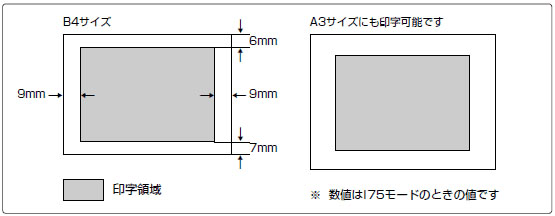 第1文字目の印字位置は、B4サイズ(標準)では縮小率の関係でiRシリーズ/imagePRESSシリーズ/imageRUNNER ADVANCEシリーズの通常の有効印字領域の左上端より、少し内側になります。