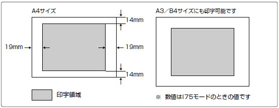 第1文字目の印字位置は、A4サイズ(標準)では縮小率の関係でiRシリーズ/imagePRESSシリーズ/imageRUNNER ADVANCEシリーズの有効印字領域の左上端より少し内側になります。ただし、A3、B4サイズの用紙を使用する場合は、印字領域の左右に若干余白が空きます。
