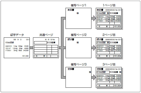 共通ページは複写用紙すべてに毎回オーバーレイ印字され、それぞれの複写ページは、対応する複写用紙のページだけにオーバーレイ印字されます。