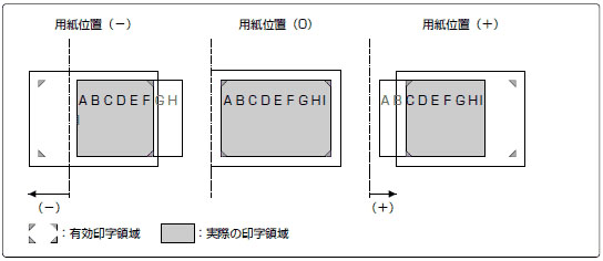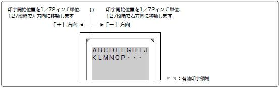 用紙の左端を基準として、印字位置を左右方向にずらす量を255段階で指定します。印字開始位置を左にずらす場合はプラス(+)方向、右にずらす場合はマイナス(-)方向になります。