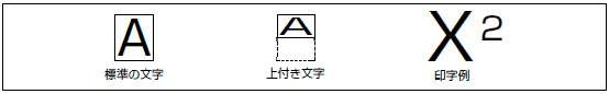 上付きを指定すると、ANK文字の縦方向を1/2の大きさに縮小して、標準の大きさの文字の上半分に印字します。