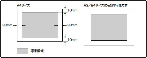 ただし、A3、B4サイズの用紙を使用しても、A4サイズのときと同じ縮小率で印字され、用紙のほぼ中央にレイアウトされます。