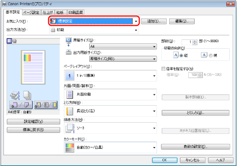 さまざまな印刷設定が「お気に入り」としてあらかじめ用意されています。[お気に入り]リストから項目を選択するだけで、目的に応じた設定ができます。