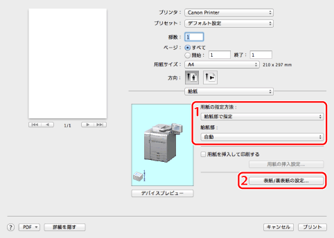 特定の用紙に印刷したい場合、その用紙がセットされている給紙部、またはその用紙種類を指定します。