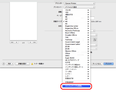[用紙サイズ]から[カスタムサイズを管理]を選択