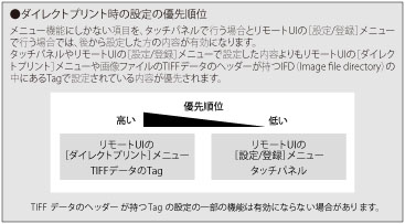 メニュー機能とアプリケーションソフトやプリンタードライバーとで同じ設定項目がある場合には、アプリケーションソフトやプリンタードライバーで設定した内容の方が有効になります。また、メニュー機能にしかない項目を、タッチパネルで行う場合とリモートUIで行う場合では、後から設定した方の内容が有効になります。