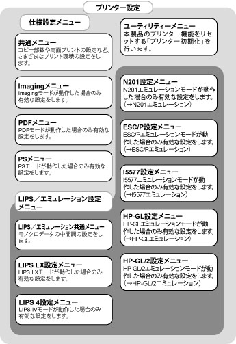 各動作モード(LIPS LX、LIPS IV、N201、ESC/P、I5577、HP-GL、HP-GL/2)の設定をします。LIPS、N201、ESC/P、I5577、HP-GL、HP-GL/2の各モードに共通の「LIPS/エミュレーション共通メニュー」と専用の「LIPS LX設定メニュー」、「LIPS4設定メニュー」、「N201設定メニュー」、「ESC/P設定メニュー」、「I5577設定メニュー」、「HP-GL設定メニュー」、「HP-GL/2設定メニュー」があります。