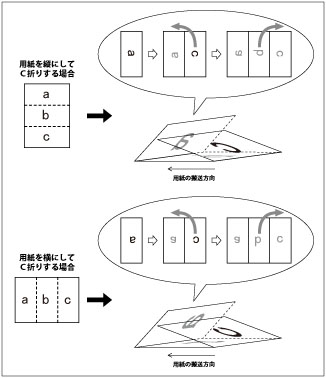 通常、C折りする場合のプリント面はオモテになりますが、「排紙面指定」で[フェイスアップ]に設定すると、プリント面をウラ(内側)にしてC折りすることができます。ただし、両面で印刷した場合は、オモテ面とウラ面の両方にプリントされた状態でC折りが行われます。