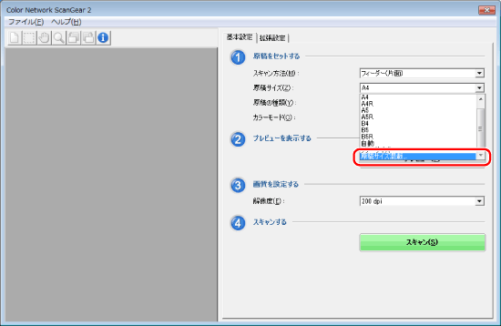 定形サイズ以外の原稿がある場合、[原稿サイズ混載]の機能は使用できません。定形サイズ以外の原稿を読み取るときは、[原稿サイズ]から[フリーサイズ]を選択してください。このとき、同じ幅の原稿のみ、一度にスキャンできます。
