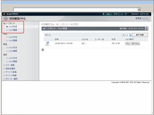ファクスボックス、システムボックスからのプリントジョブを含むローカルプリントジョブ履歴を表示します。