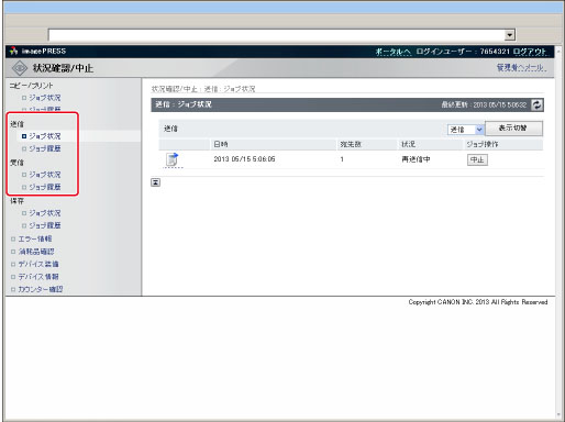 送信ジョブ履歴: