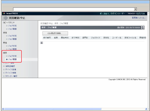[ジョブ履歴]→[CSV形式で保存...]→[保存]をクリック
