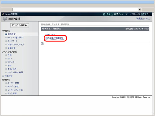 [環境設定](設定/登録)で[用紙種類リストのデフォルト表示の変更]を設定していた場合でも、リモートUIには反映されません。リモートUIのデフォルトの設定は「登録(降順)」です。