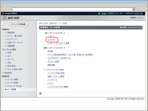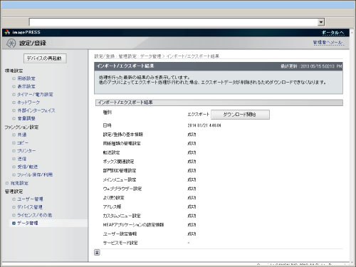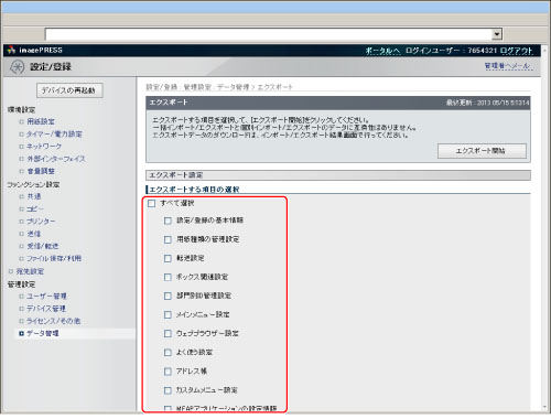 一括インポートする場合、部門別ID管理設定が含まれているとシステム管理者情報(IDやパスワード)が上書きされます。インポート後、ログインする際にはエクスポート元のシステム管理者情報が必要となりますので、一括エクスポートする前にあらかじめご確認ください。