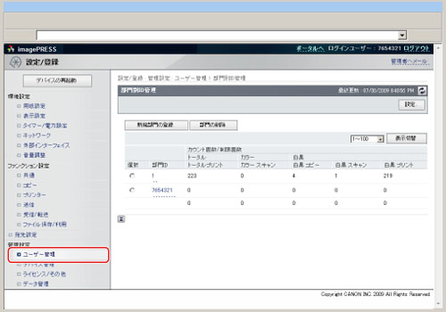 リモートUIから行うことができる部門別ID管理は、本体操作パネルの[ユーザー管理](設定/登録)→[部門別ID管理]からも行うことができます。部門別ID管理の詳しい説明は、「部門別ID管理について」を参照してください。