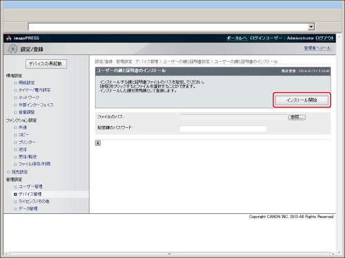 鍵ペアとサーバー証明書をインストールする場合は、管理者としてログインする必要があります。
