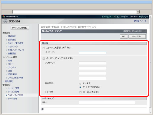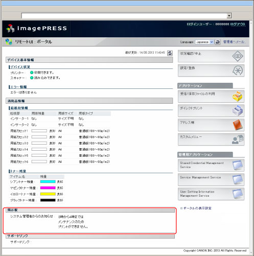 「掲示板」とは、管理者が本製品の使用者に知らせたいメッセージをタッチパネルディスプレーやリモートUI に表示する機能です。掲示板の表示法の設定やメッセージの入力はリモートUI から行います。