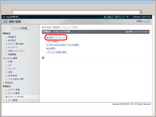 [設定/登録]をクリック→管理設定に表示されるメニューから[ライセンス/その他]を選択→[掲示板/サポートリンク]をクリック