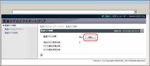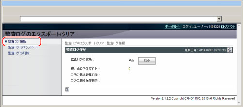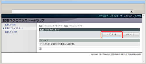 本体から収集した各種ログをエクスポートする際には、SSLまたはIPsecをご使用ください。SSLを使用する場合は、[管理設定](設定/登録)にある[リモートUIのON/OFF]の[SSLを使用]をONに設定してください。IPSecを使用する場合は、「IPSecの設定」を参照してください。