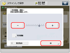<背景調整>で[調整]を押して調整値を変更すると、[自動]の設定は解除されます。また、[調整]で濃度調整をしているときに[自動]を押すと、調整値は解除され、下地の画質を自動的に調整します。