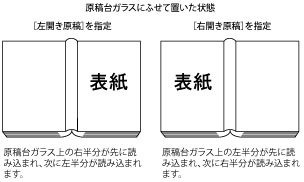 ブック原稿の左右どちらのページから読み込むかを、ブック原稿の開きかたで指定します。原稿台ガラスにふせて置いた状態によって、次のように指定してください。