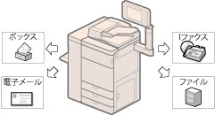 スキャナー部で取り込んだ紙文書を、Eメール、Iファクスを利用して他の人に配布できます。文書のやりとりが効率的になります。また、Eメールや、FTP、SMB、WebDAVなどのファイルサーバーに送信すると、紙文書が電子化されるので、コンピューターでの閲覧やデータ管理にご利用いただけます。