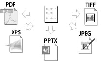 送信するデータのファイル形式は、PDF、XPS、OOXML(pptx形式/docx形式)、JPEG、TIFFから選択できます。受け取り側の環境や用途に合わせてファイル形式を設定できます。