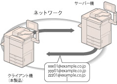 本製品はクライアント機として、ネットワーク上のサーバー機にアクセスして、サーバー機のアドレス帳から宛先を検索/指定できます。