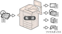 あらかじめ設定した条件に一致するIファクス文書を、指定の宛先に、お好みの送信設定で転送できます。また、受信したIファクス文書を他の機器に転送する「中継」や、転送先に任意のファクスボックスを指定する「親展」が可能です。タイマーを設定して転送設定が有効になる時間を指定することもできます。さらに、本製品では、条件に一致しなかったIファクス文書の転送先も指定しておくことができるので、受信した文書の仕分け配信機能として利用できます。(→転送設定を登録する)