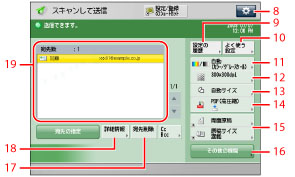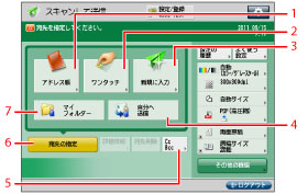 ファクスの宛先は、[ファクスファンクションの表示]の<「スキャンして送信」にファクスを表示>を「ON」に設定すると表示されます。(→ファクスファンクションを表示する)