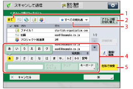 (Eメール)、 (ファクス)、 (ファイル)、 (グループ)、 (Iファクス)を押すと、それぞれの宛先を表示します。 |