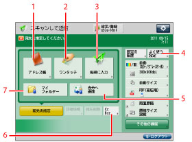 [新規宛先の制限]で新規宛先の入力制限が「ON」に設定されている宛先種別は、新規で宛先を入力できません。すでに登録されている宛先をローカルアドレス帳、リモートアドレス帳、LDAPサーバーから検索、または、ワンタッチから選択してください。(→新規宛先への送信を制限する)