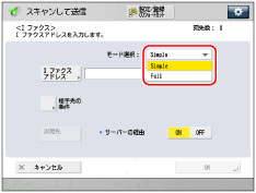 NTTコミュニケーションズのインターネットファクス中継サービスを利用するには、「Simple」を選択してください。これにより、読み込まれたデータがファクスへ転送されます。なお、このサービスを利用するには、NTTコミュニケーションズとの契約が必要です。詳しくはNTTコミュニケーションズにお問い合わせください。