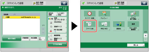 ページごとに分割する: ファイル名、送信時の年月日、送信時の時分秒、ページ番号を表す5桁の数字がファイル名になります。 例: ファイル名_20140707203000_00002.tif ファイル名_20140707203000_00002.jpg ファイル名_20140707203000_00002.pdf ファイル名_20140707203000_00002.xps ページごとに分割しない: ファイル名、送信時の年月日、送信時の時分秒がファイル名になります。 例: ファイル名_20140707203000.tif ファイル名_20140707203000.pdf ファイル名_20140707203000.xps ファイル名を設定しない