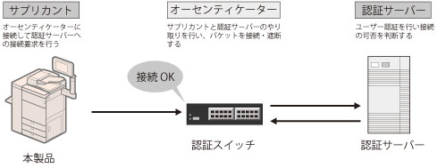 認証サーバー(RADIUS:Remote Authentication Dial In User Service)で認証情報を一括管理して、サプリカントを認証します。RADIUSサーバーに認証されたサプリカントのみがオーセンティケーターに通信を許可されてネットワークへ接続できるため、不正なアクセスを防ぐことができます。